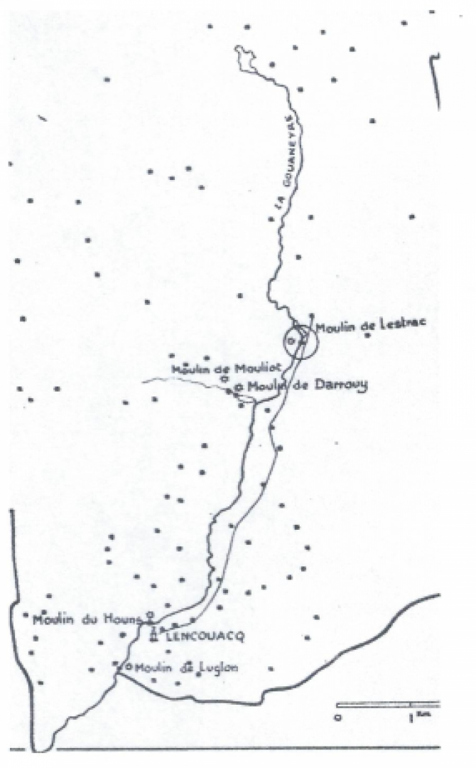 Au cours son séjour à Lestrat, il est chargé par Mr Druheo, Conservateur des Eaux et Forêts, d’une enquête d’architecture rurale et d’ethnographie dans le cadre d’un projet de création du Musée forestier d’Hossegor. C’est ainsi qu’il réalise l’étude remarquable des 5 moulins de Lencouacq avec la généalogie des familles de meuniers et surtout des schémas exceptionnels de la machinerie (meules, turbines, bluteur, élévateur etc...plus de 80 dessins et 40 pages de descriptions parfaitement détaillées).